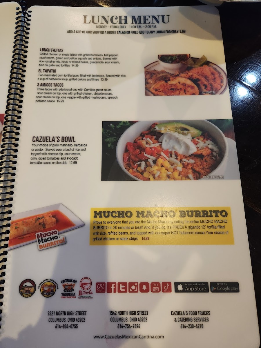 Welcome to Cazuelas Mexican Restaurant & Cantina, a vibrant culinary gem nestled at 6325 E Broad St, Columbus, OH. Here, the essence of Mexico is captured in every dish, from their delectable Cancun Chicken, graced with shrimp and pineapple, to the savory Enchiladas Suizas topped with green sauce and queso fresco.